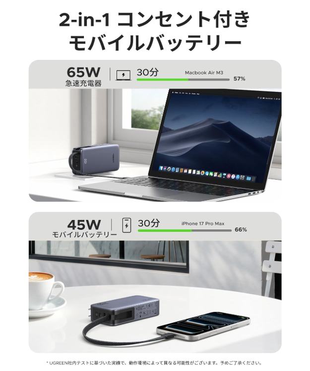 本日2026年3月16日は、外出先でもノートPCやスマートフォンを素早く充電できるUGREENの「コンセント一体型モバイルバッテリー」がお得に登場しています。