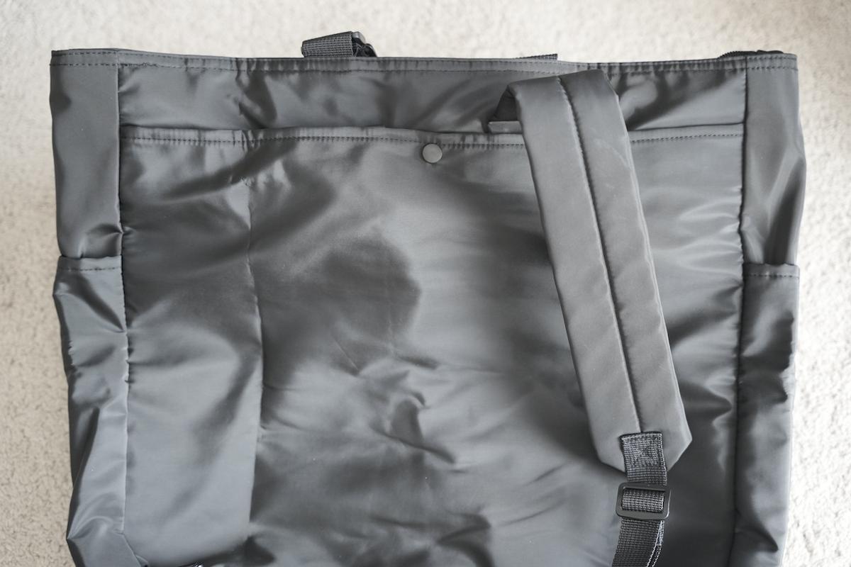 バッグ上部の開口部はファスナーで閉まるようになっているのと、生地全体に撥水加工が施されているので、小雨程度であれば問題なく使えます!