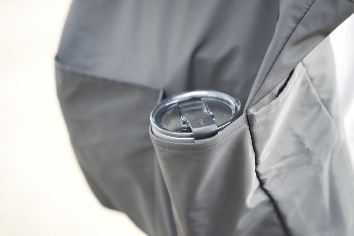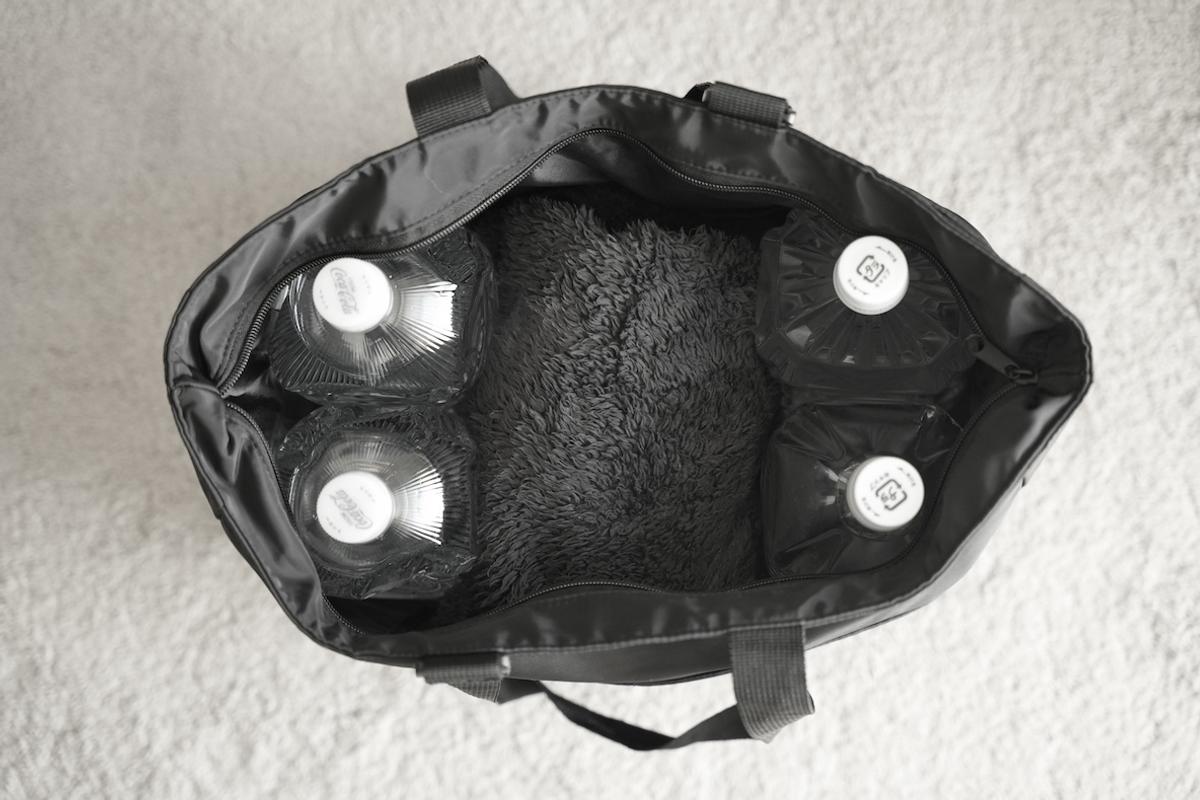 なお、バッグの収納力もしっかりあって、2Lのペットボトル4本と、ユニクロのけっこう嵩張るフリースが問題なく入ります。