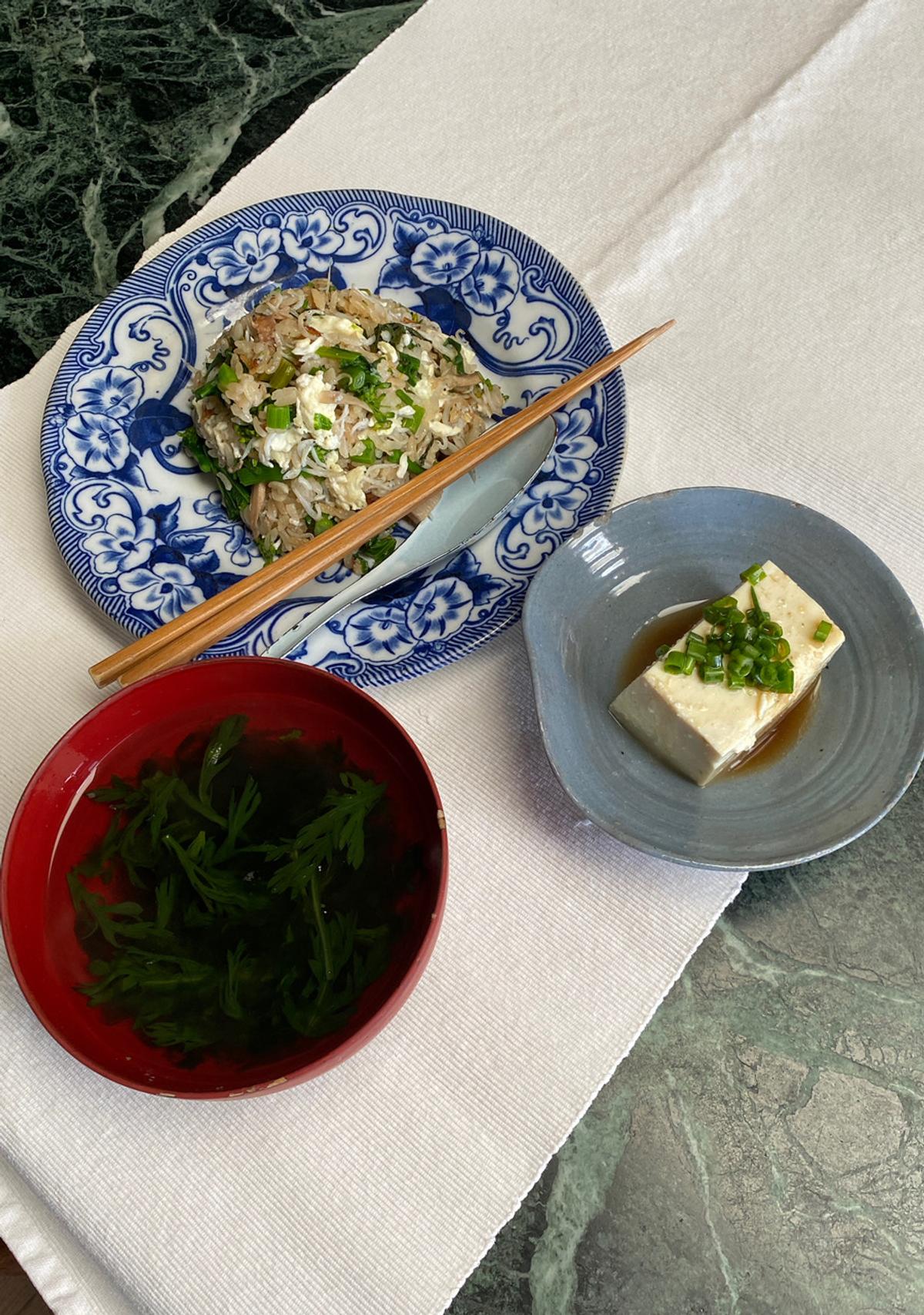 六目チャーハン(残っていた炊き込みご飯=ごぼう、蓮根、鶏肉、チーマデラーパ&卵白+しらす)と春菊のスープ。だだちゃ豆腐、