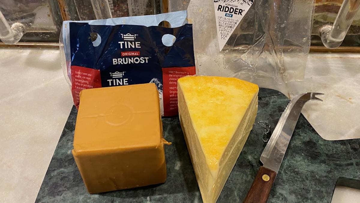 ノルウェーのチーズ2種(キャラメル味のブルノスト&セミハードのリダー。高橋百合子さんから頂戴。初めて食べたノルウェーのチーズ。美味しかった。ごちそうさま)。