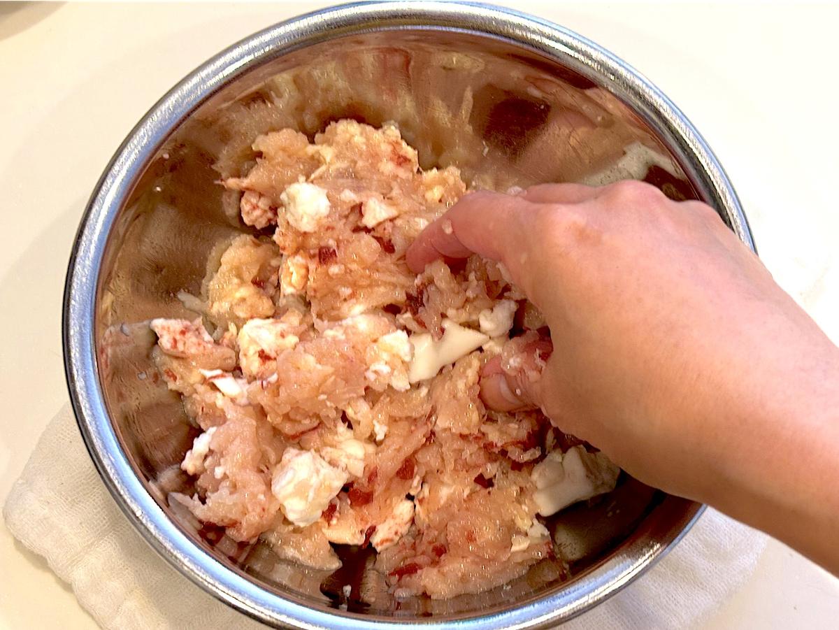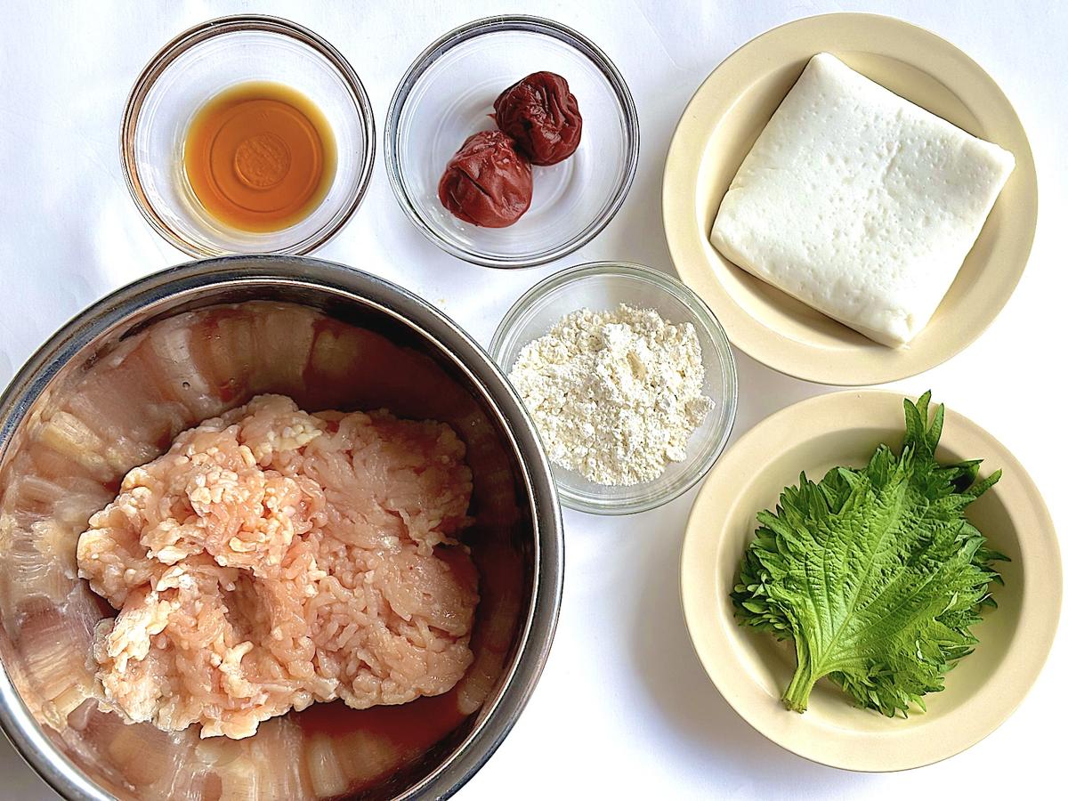 2. ボウルに鶏ひき肉、1の梅干しを入れ、はんぺんをちぎりながら加える。はんぺんをつぶしながら全体をよく混ぜる。