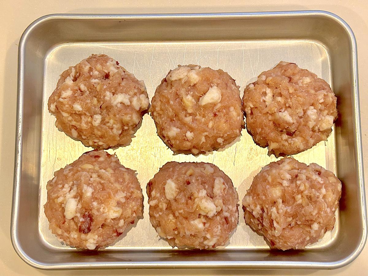 丸く成型するとき、大葉のサイズに合わせてタネの大きさを決めるといいですね。今回は大きな大葉に合わせて6個にしましたが、個数が欲しいときは小さめの大葉を選んでみてください。