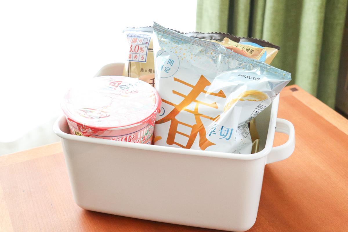 たとえばストック用のお菓子や食材を入れておくと、適度に生活感を消しつつインテリアに馴染んでくれます。