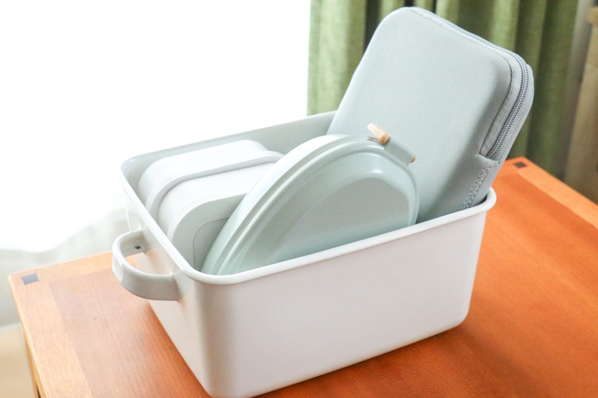 結構かさばるアイテムが多いので、深い容器にまとめて置けるのは便利です。