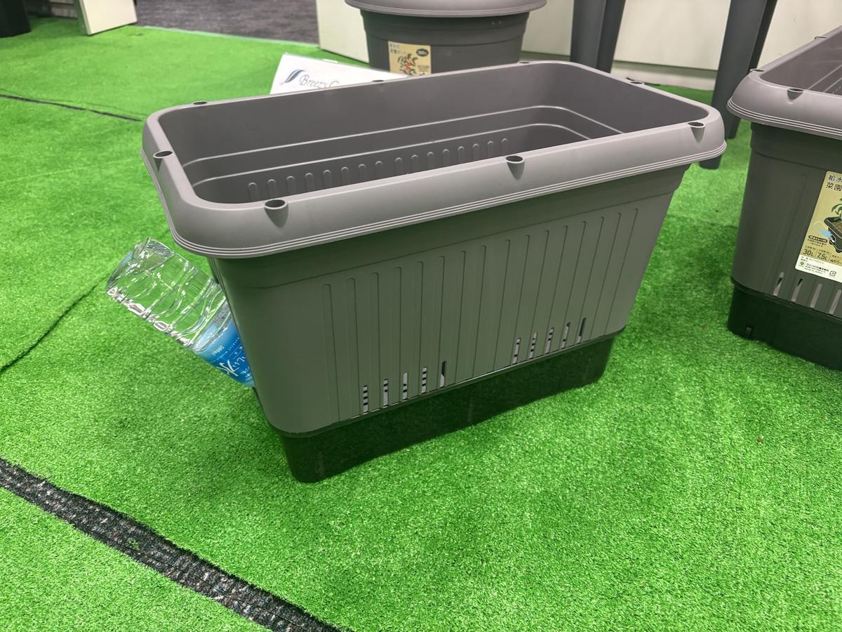 「給水式菜園プランター(1,180円 ※税込)」は、ペットボトルをセットしておくだけで底面からじわじわ給水してくれる設計。マットなダークトーンのカラーリングは、モダンな住宅の外観にもしっくりなじみます。鉢底にはキャスターが付属しており、移動しやすいのも高ポイント!