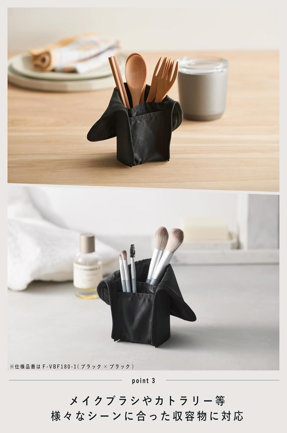 小さなスペースにも立てて置けるので、外出先のカフェや会議室でも活躍します。さらに、メイクブラシやカトラリーの収納など、オフィス以外のシーンにも応用できる汎用性の高さも◎。
