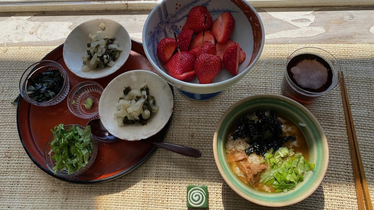 和久傳の「生姜鯛味噌茶漬け」(三つ葉、刻み海苔、わさび)。お茶漬けを食べるのすごく久しぶり。和久傳のお茶漬けはさすがに美味しいなあ。杓子菜漬け、苺。