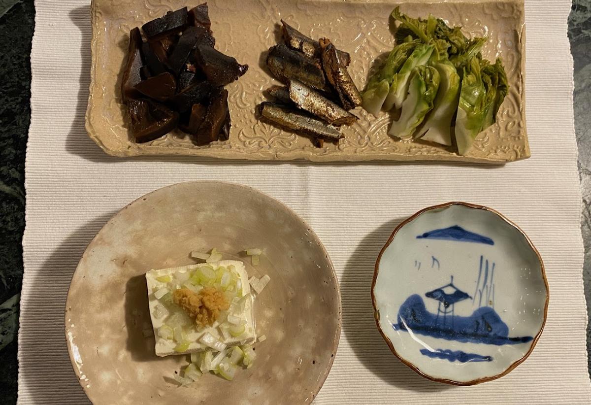 豆吉の木綿豆腐、自家製ぬか漬けの春蕾、和久傳(どんこ、福の梅鰯)。