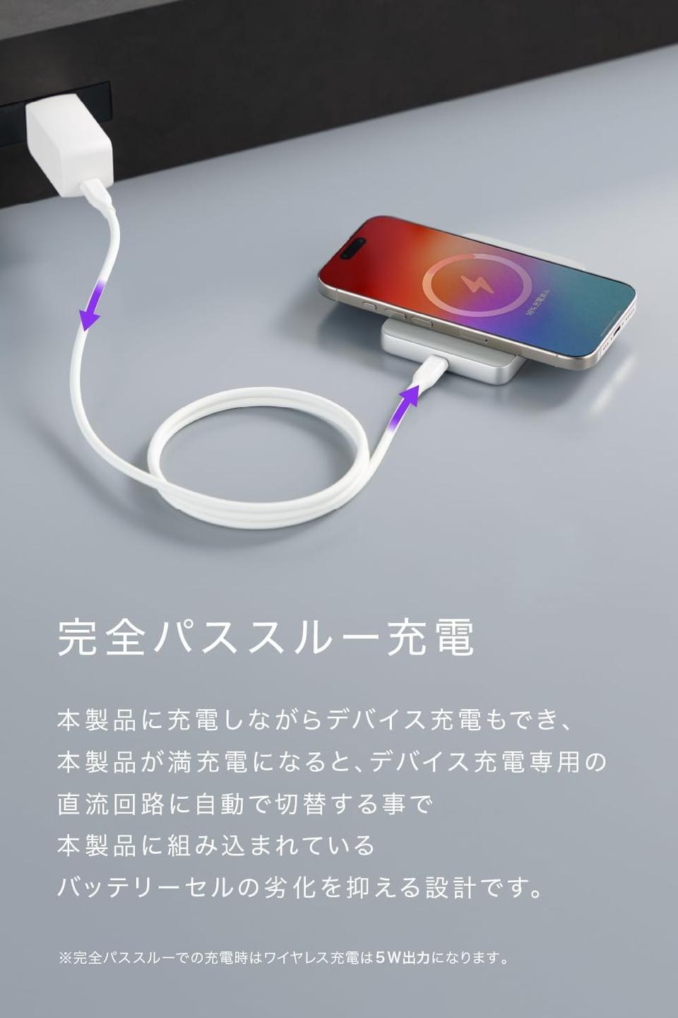 完全パススルーとはモバイルバッテリーを充電すると同時にデバイスにも給電でき、モバイルバッテリー満充電後はデバイスへの直接充電に切り替えるという仕組みです。