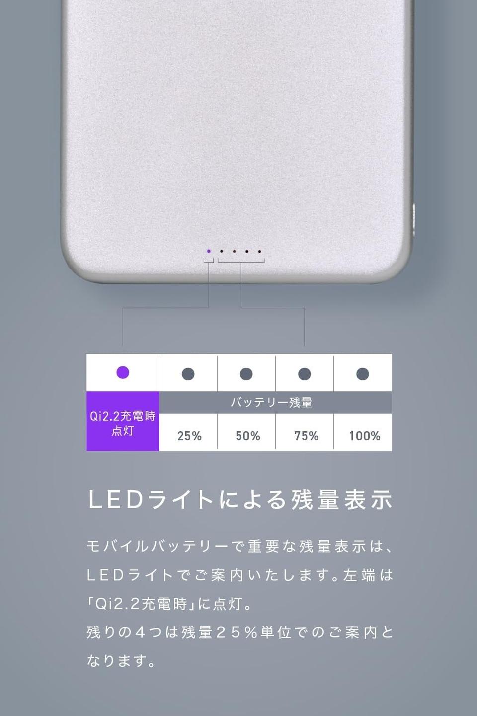 モバイルバッテリーの残量は本体下部のLEDライトでわかるようになっていて、100%から25%まで、25%単位で表示。