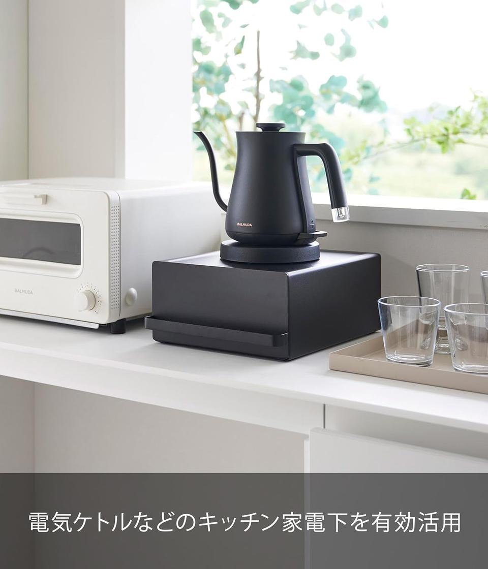 山崎実業(Yamazaki)の「引き出し付きキッチン家電下ラック タワー」は、電気ケトルやコーヒーメーカーの下を収納に変える引き出し付き設計で、デッドスペースを有効活用できるキッチンラック。