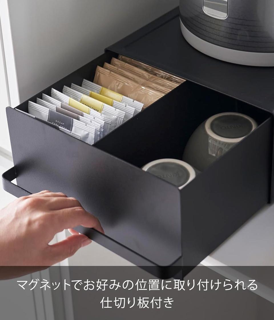 引き出し内部には、マグネットで好きな位置に取り付けられる仕切りが付属。収納するアイテムに合わせてレイアウトを柔軟に変えられるため、無駄なくスペースを使えます。