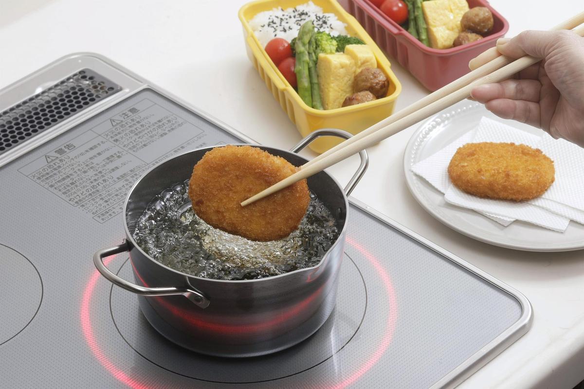 例えばコロッケを揚げるなら、コロッケの二回りほど大きいサイズ感で、少ない油でも無駄なく効率的に揚げられるのです。まさにお弁当づくりや1〜2人分の調理に最適。