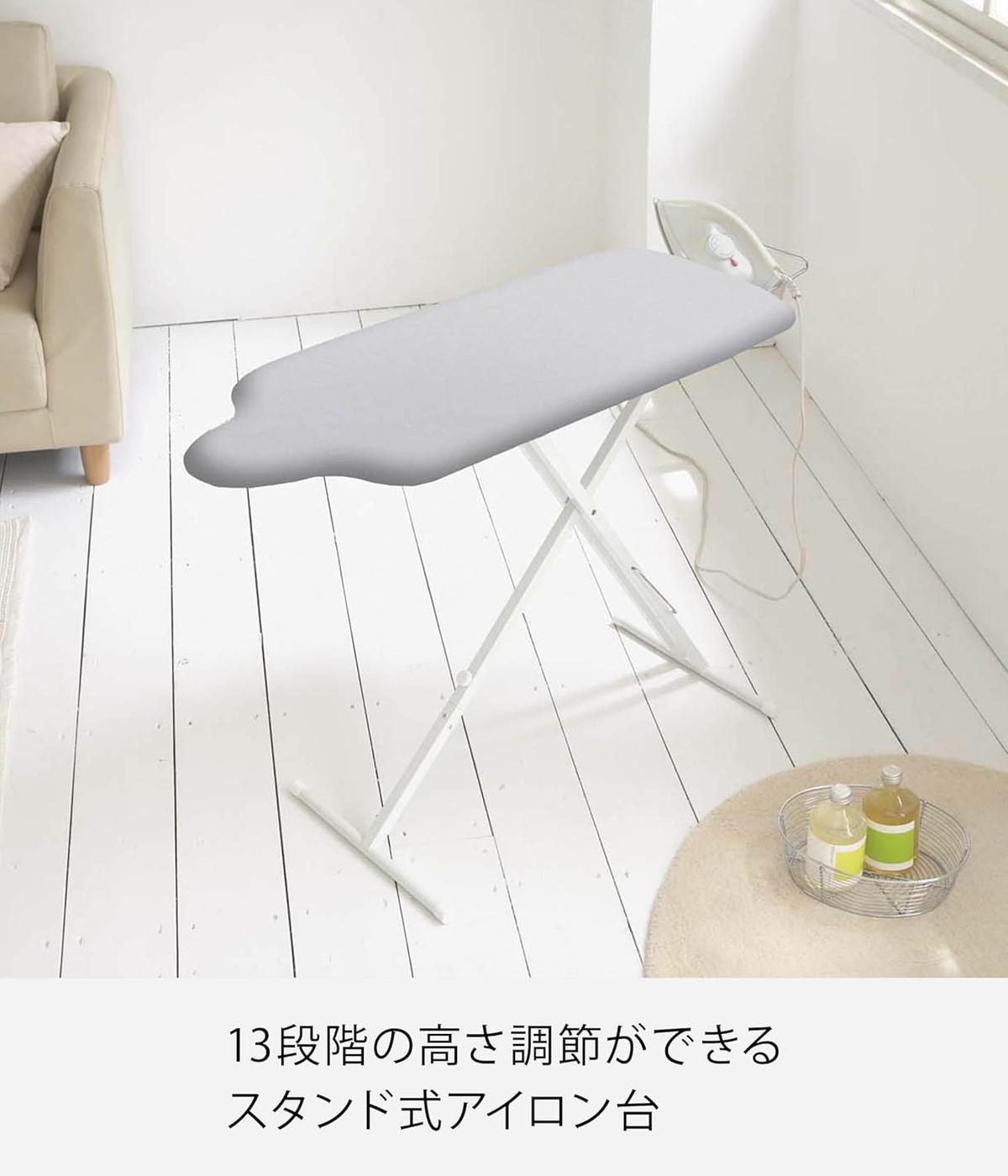 本製品は、使う人のスタイルに合わせて調整できるアイロン台です。スタンド式で立ったまま作業ができるうえ、13段階の高さ調整に対応し、座り・立ちどちらでも快適に使える設計が特長。