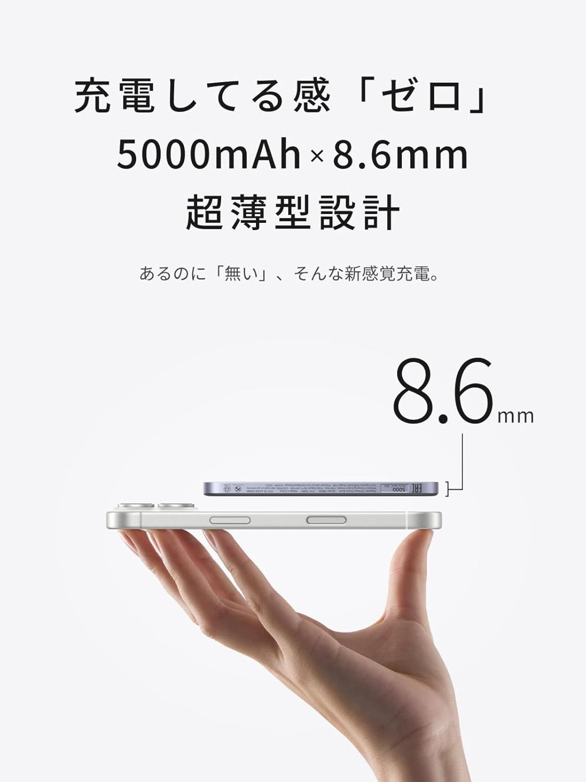本製品は、わずか8.6mmの薄さを実現したコンパクト設計が魅力のモバイルバッテリー。バッグやポケットにもすっと収まり、持ち運びのストレスを感じにくいサイズ感です。