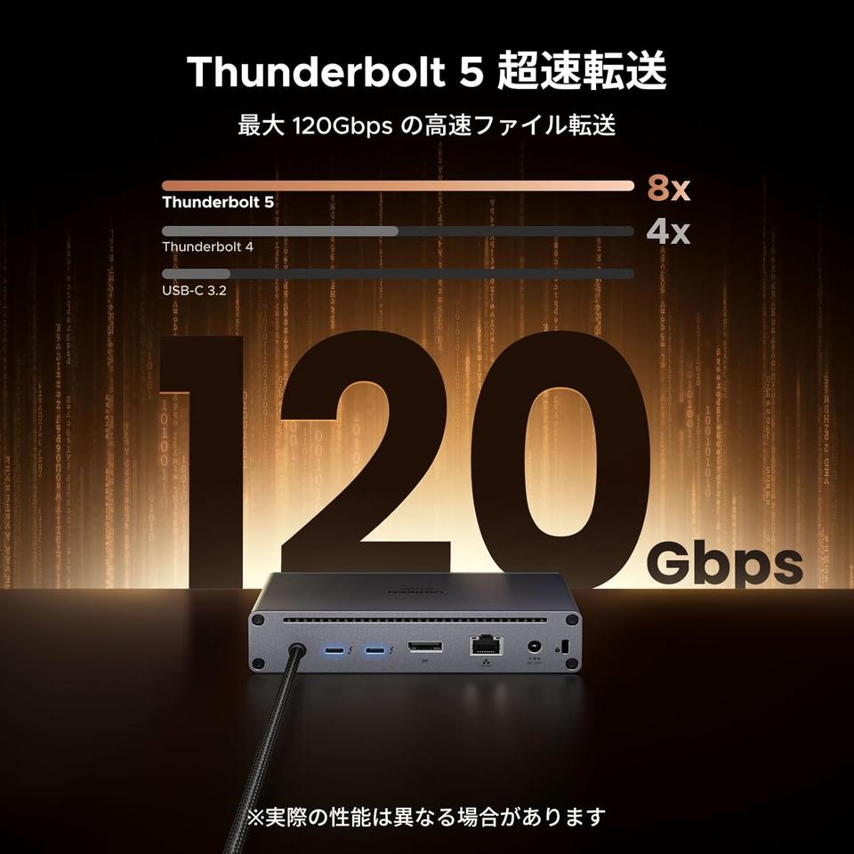 本製品は、次世代規格Thunderbolt 5に対応し、最大120Gbps(帯域ブースト時)という圧倒的な通信速度を実現したモデルです。これにより、大容量データの転送や複数デバイスの同時接続でも安定したパフォーマンスを発揮。
