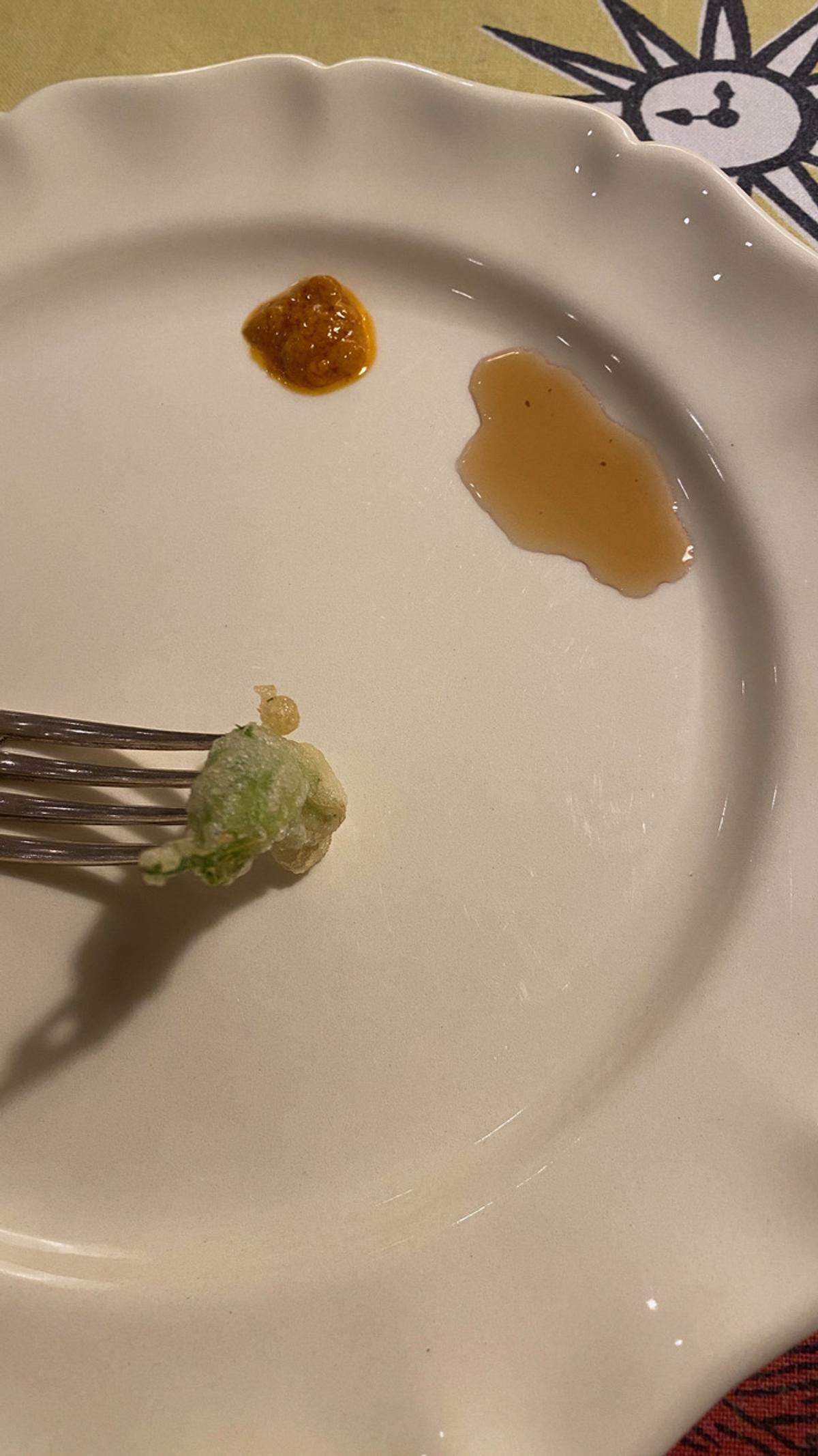 お皿にルイユとコラトゥーラをちょこっと用意して、フリットをつけて食べる。