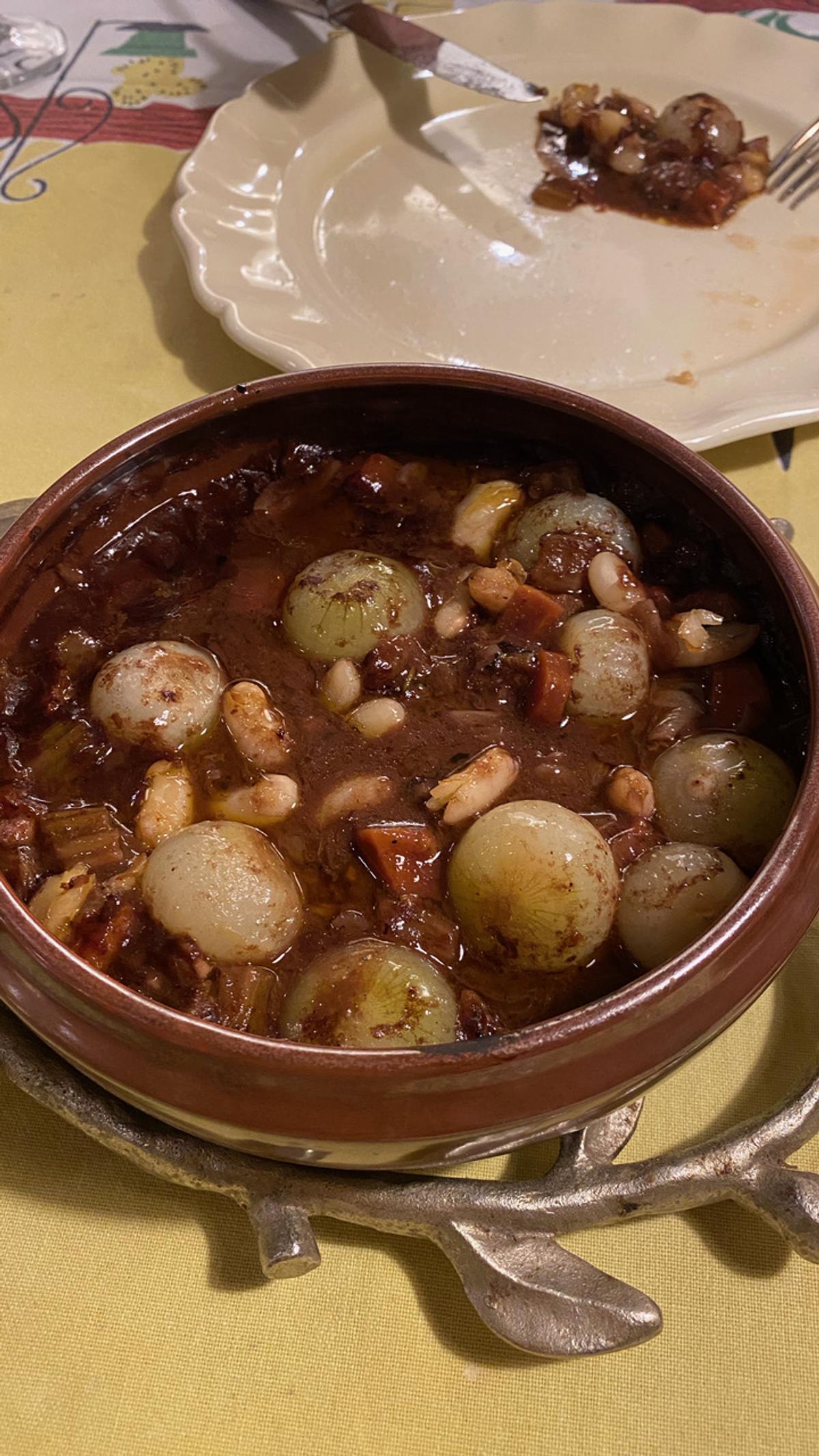 冷凍室で発見した「赤ワイン煮」「ブルギニョン」と書かれた容器。2つを合体させ、茹でたチビ玉ねぎ(ペコロス)と白インゲン豆を加えた。これが、これが旨いの! 肉は残っていない、ソースだけの残り物なんだけど、肉のエキスが含まれていて、豊かな料理を食べている感じ。