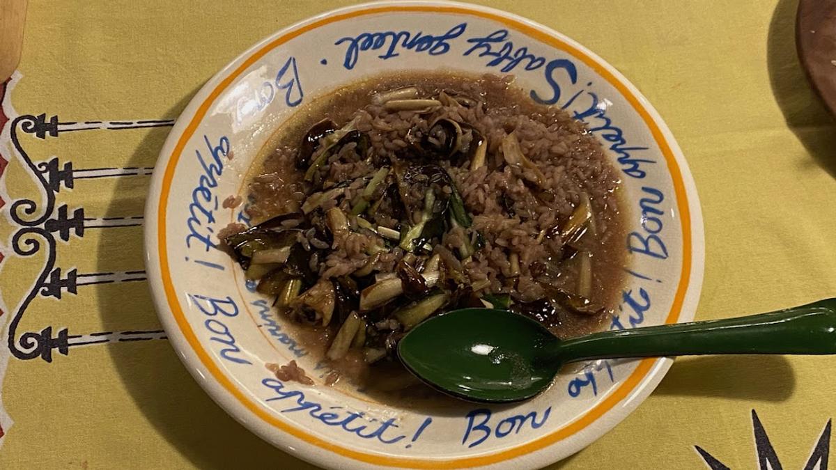 「これが最後の収穫」と手渡されたラディッキオ・タルディーヴォで赤ワインのリゾット。こんなふうに過ごせば、あと2日くらいは持ちそうだ。