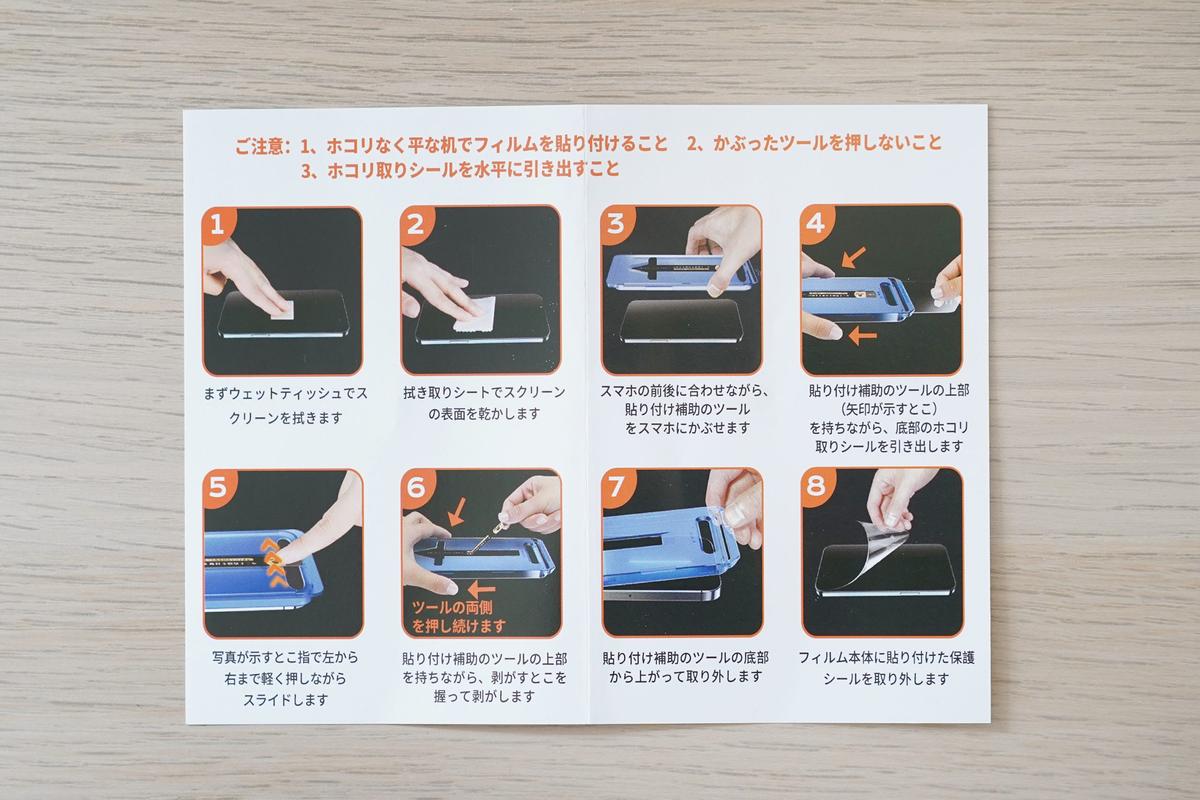 内容物は、保護フィルムの入ったカバー、クリーニングキット、ヘラ、そして作業手順がわかりやすく書かれた説明書。