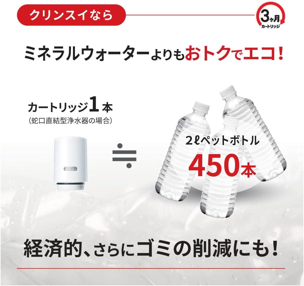 カートリッジ1本で、2Lのペットボトル約450本分の浄水が可能! 毎日買っていた手間もコストも、ぐっと減らせます。