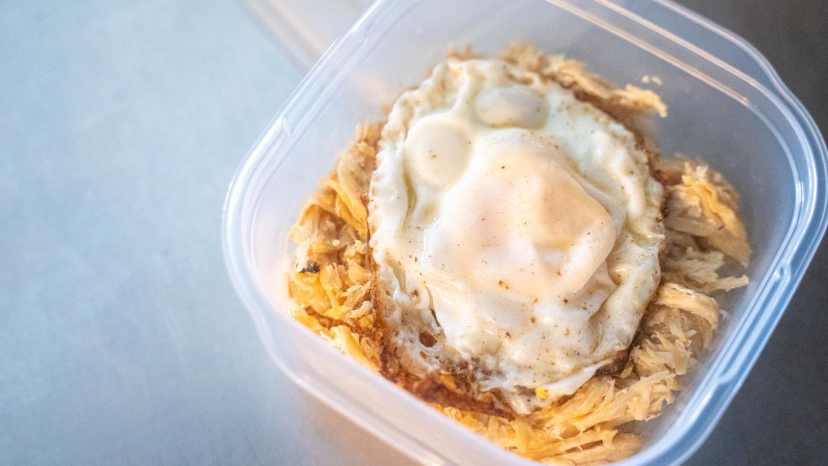 普段持ち歩いているのは、ご飯150〜200gに鶏むね肉と卵をベースにした1食分。
