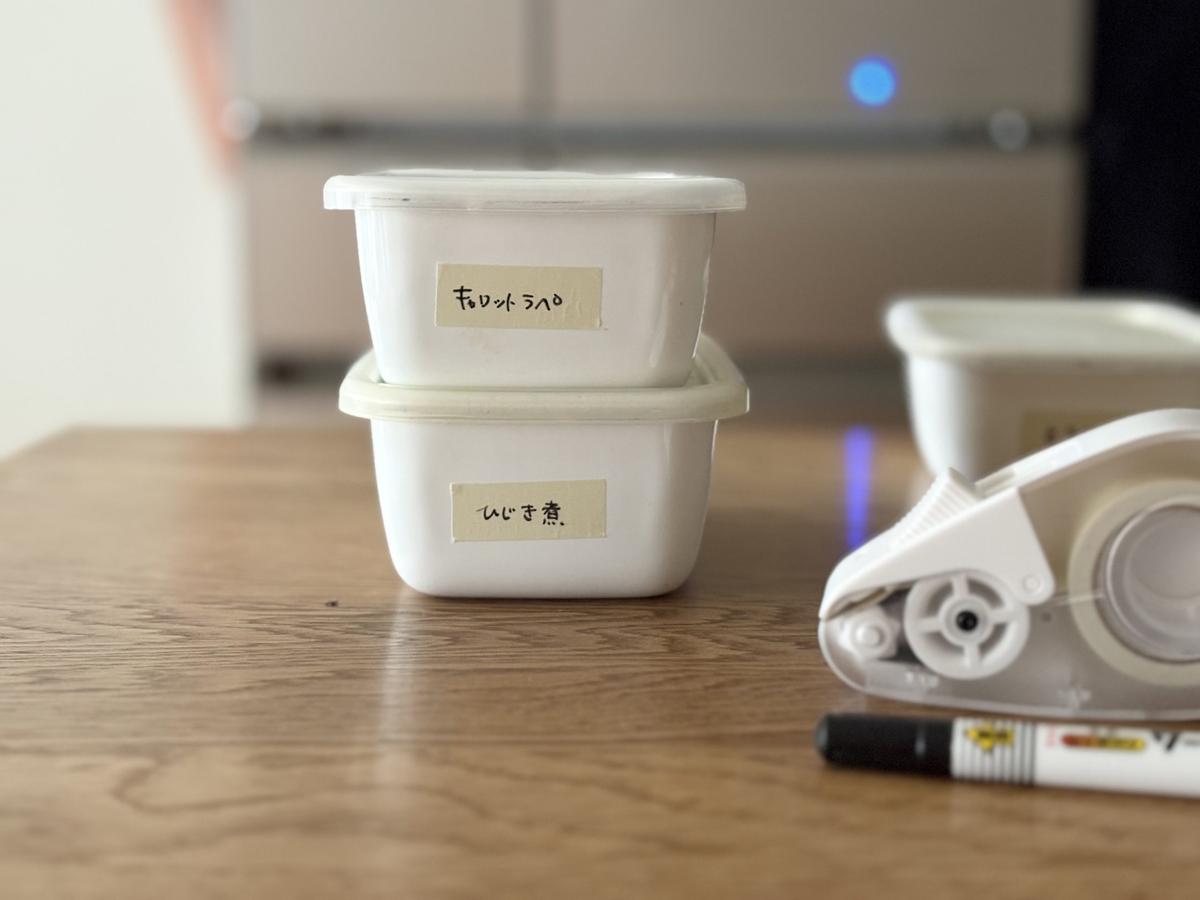何が入っているかわからない琺瑯の保存容器のラベルに。