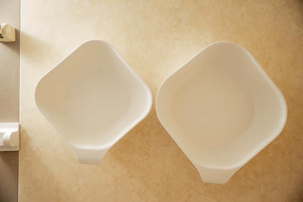 風呂イスとあわせて湯おけもお迎えしましたが、これまで使っていた湯おけ(画像左)は幅29.5cm×奥行き27cm×高さ9cmとコンパクトなものでした。