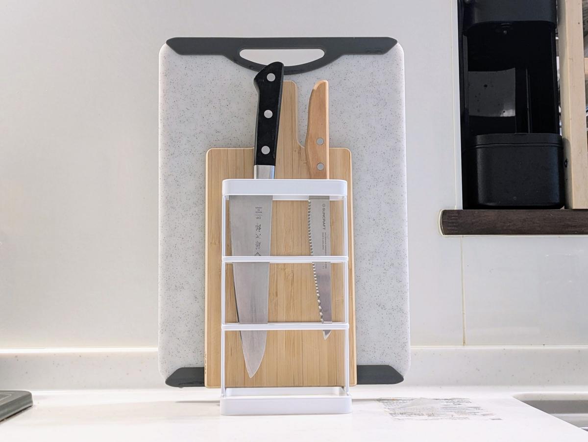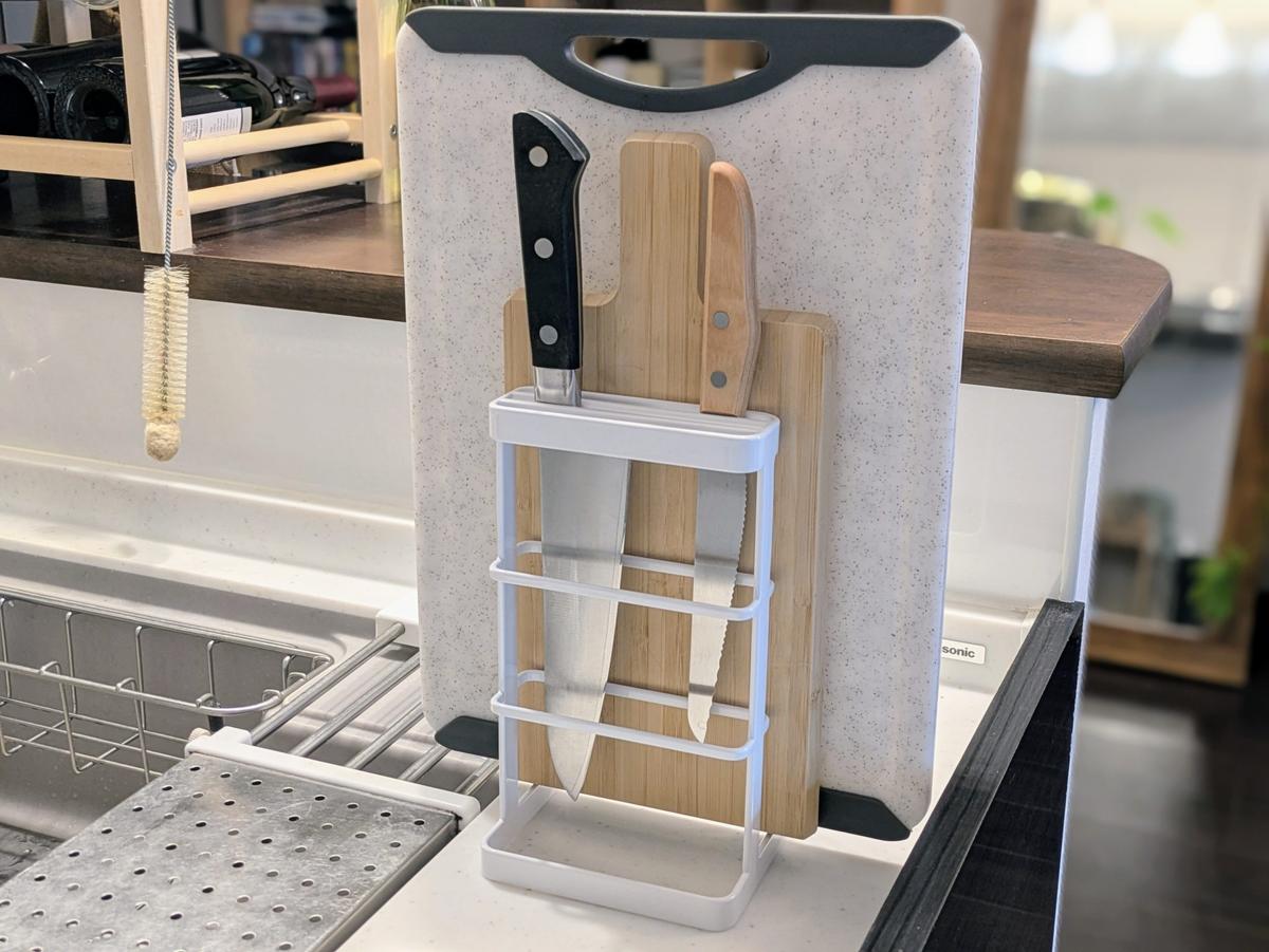 このアイテムの最大の魅力は、まな板と包丁をセットで収納できるところ。最大でまな板を2枚、包丁を3本までまとめて立てられます。