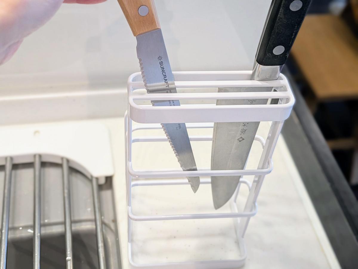 洗ったあとの「びちょびちょの包丁」も、そのまま立てておくだけでOK。4年間続いた小さな悩みも、あっけなく解決。
