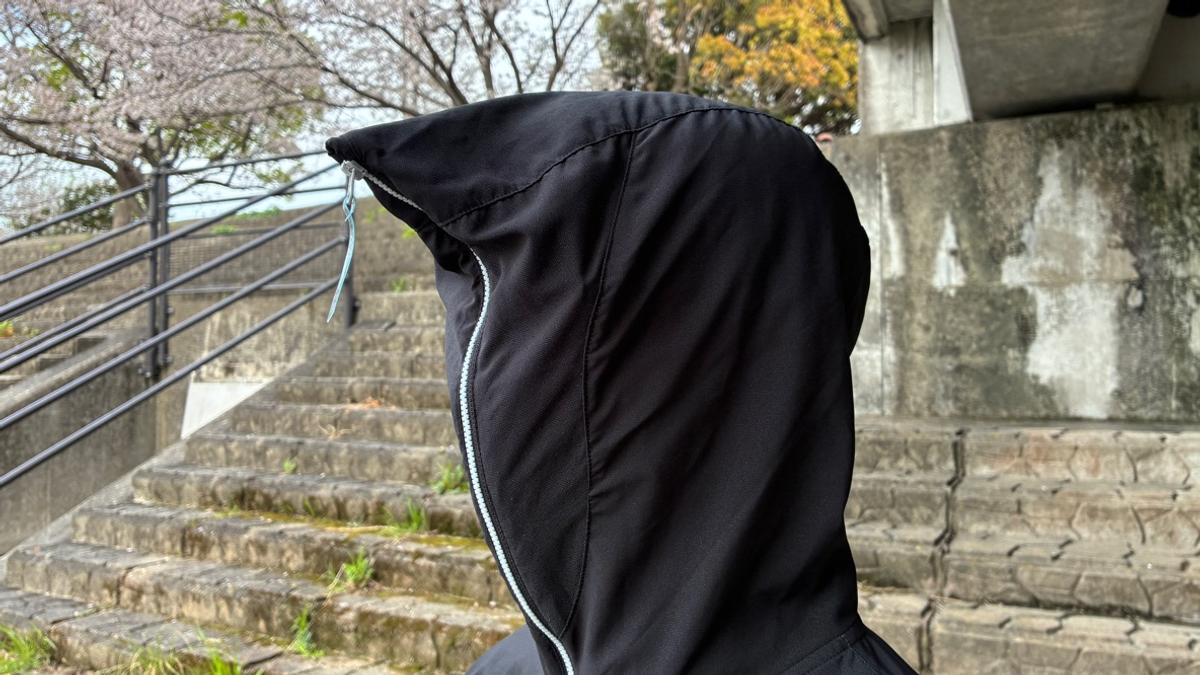 見た目は怪しさ満点ですが……。上までぴったり閉めなくても、ファスナーの範囲が広いため首やフェイスラインをしっかりガードしてくれます。