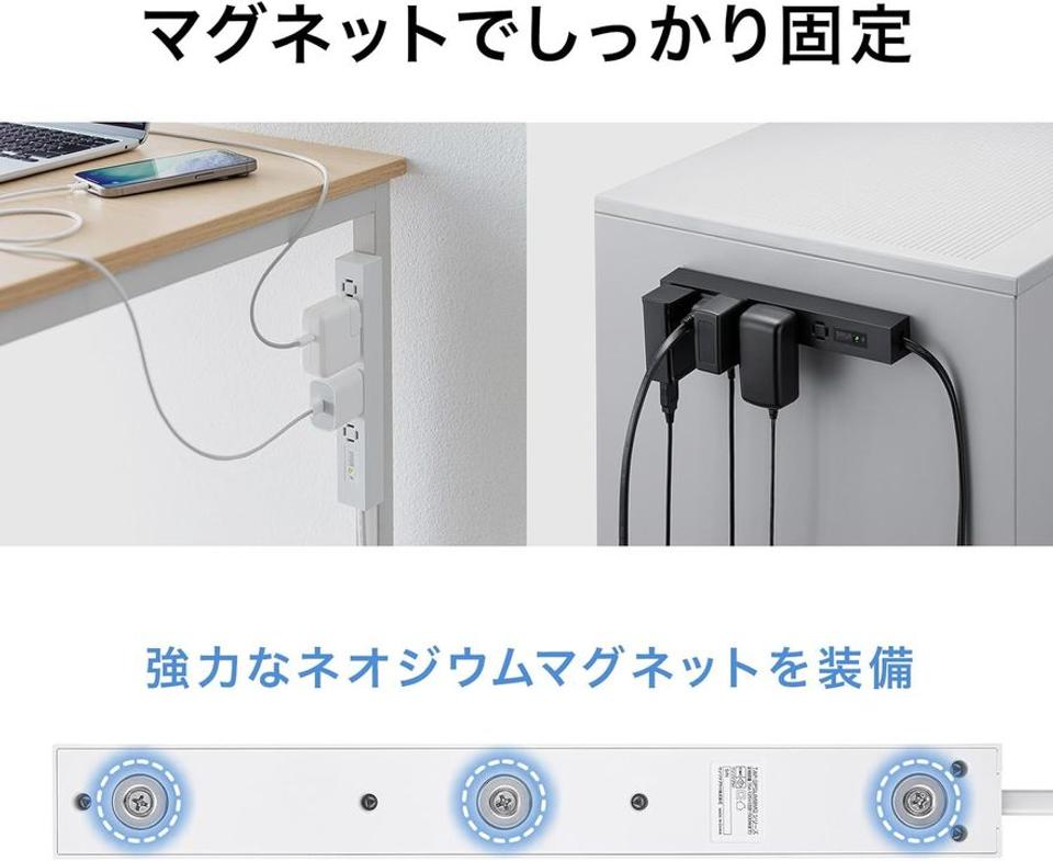 自由度について、特筆すべき点がもうひとつ。磁力が非常に強い「ネオジムマグネット」を搭載してしているため、重いACアダプタを複数差していてもスチール製のデスクサイドやラックにしっかり固定。ずり落ちを防いでくれます。