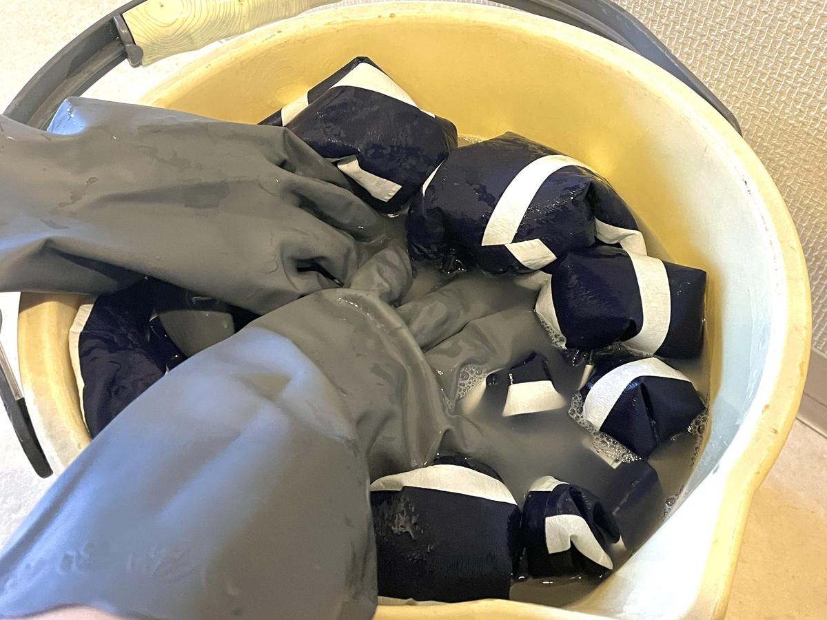 バケツに規定量の水と洗剤を入れ、ウェアをもみ洗いします。