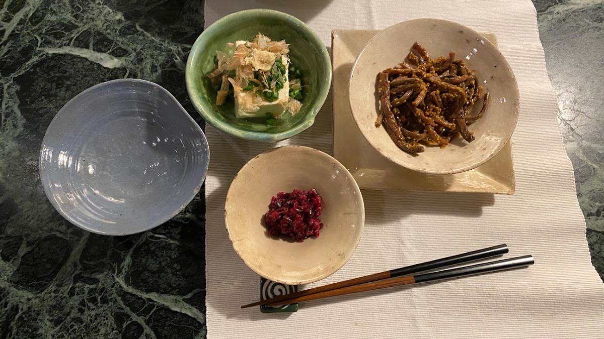 絹豆腐、ぜんまい煮、しば漬け。