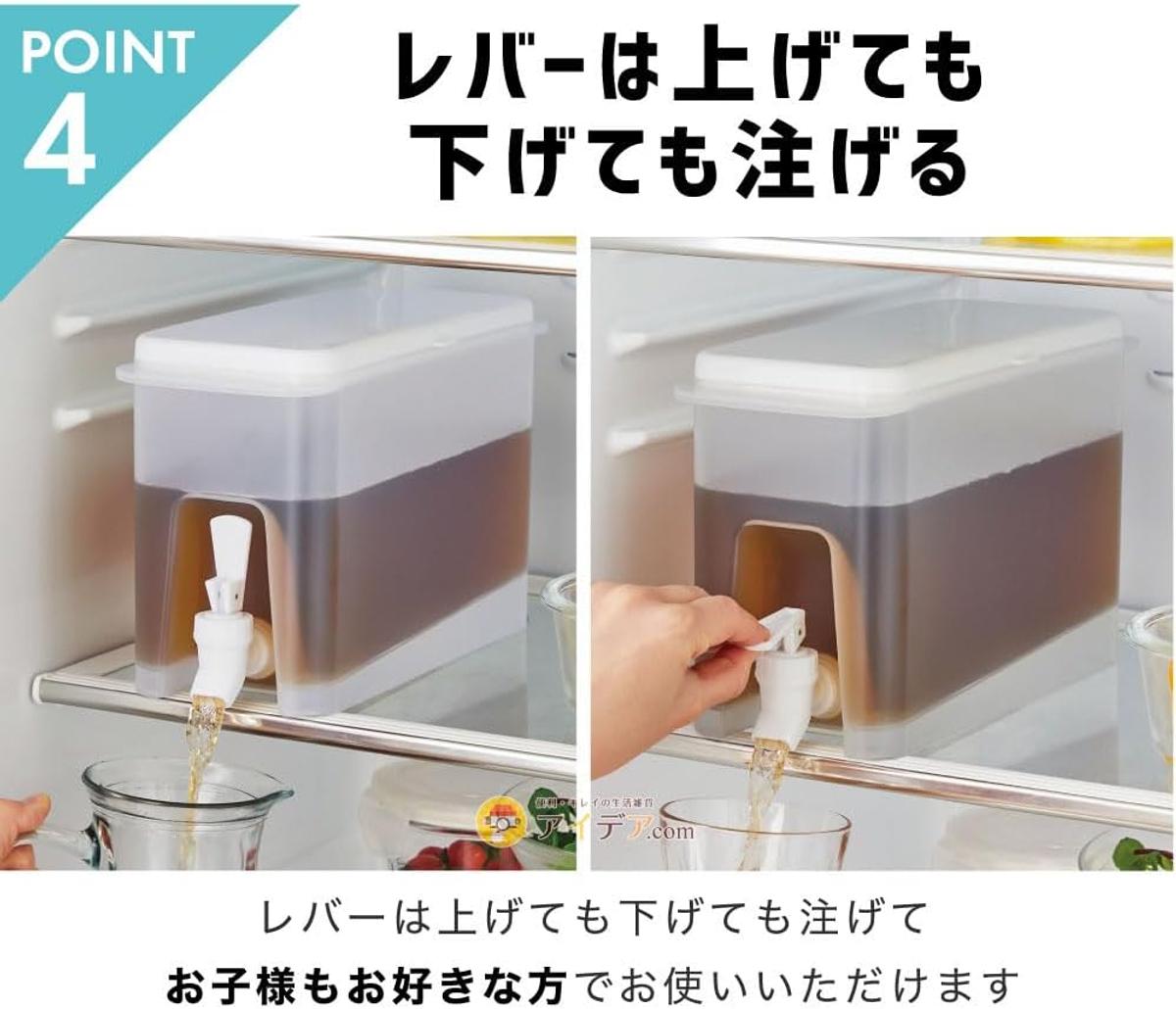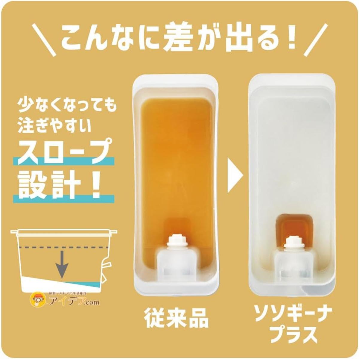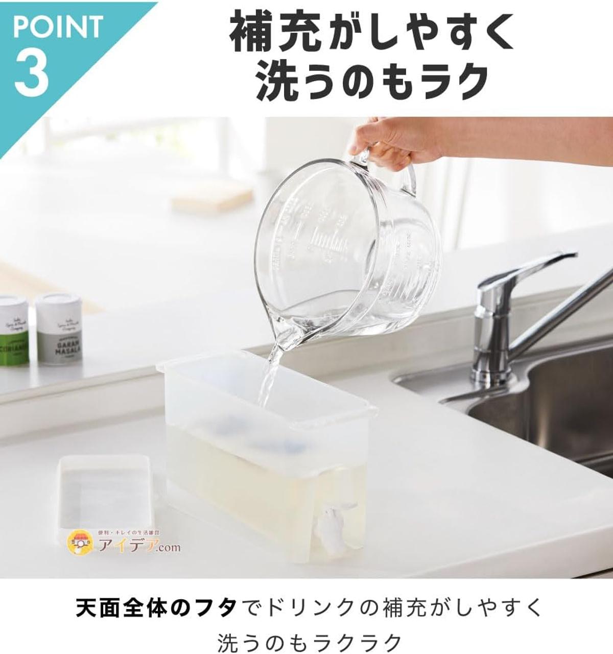優れた点は最後まで注ぎやすい「スロープ設計」。底面が蛇口に向かって斜めになっているため、中身が少なくなっても本体を傾ける必要がありません。冷蔵庫の棚に置いたまま、最後までスムーズに注ぎきることが可能です。