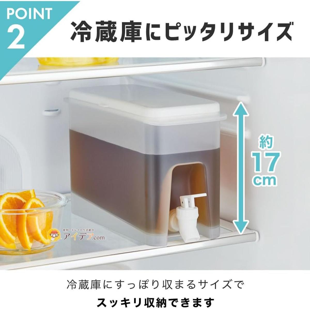 容量は2.8Lとたっぷり入りつつも、縦は17cm、横幅は約12cmとスリム。冷蔵庫の棚にすっぽり収まるサイズ感で、出し入れの手間が省けます。