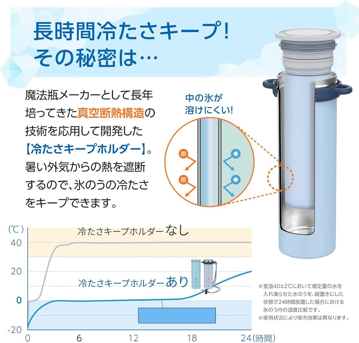 魔法瓶メーカーならではの真空断熱構造を採用、外気の熱を遮断することで、氷のう内部の冷たさを長時間キープします。実際に同メーカーによる比較データでも、ホルダーなしに比べて温度上昇が緩やかという結果が出ており、長時間の屋外利用に最適です。