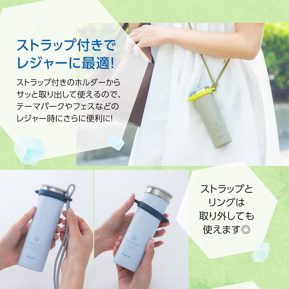 約150mLと十分なサイズを備えながら、超コンパクトデザイン! ストラップでどこでも持ち歩ける冷却アイテムに