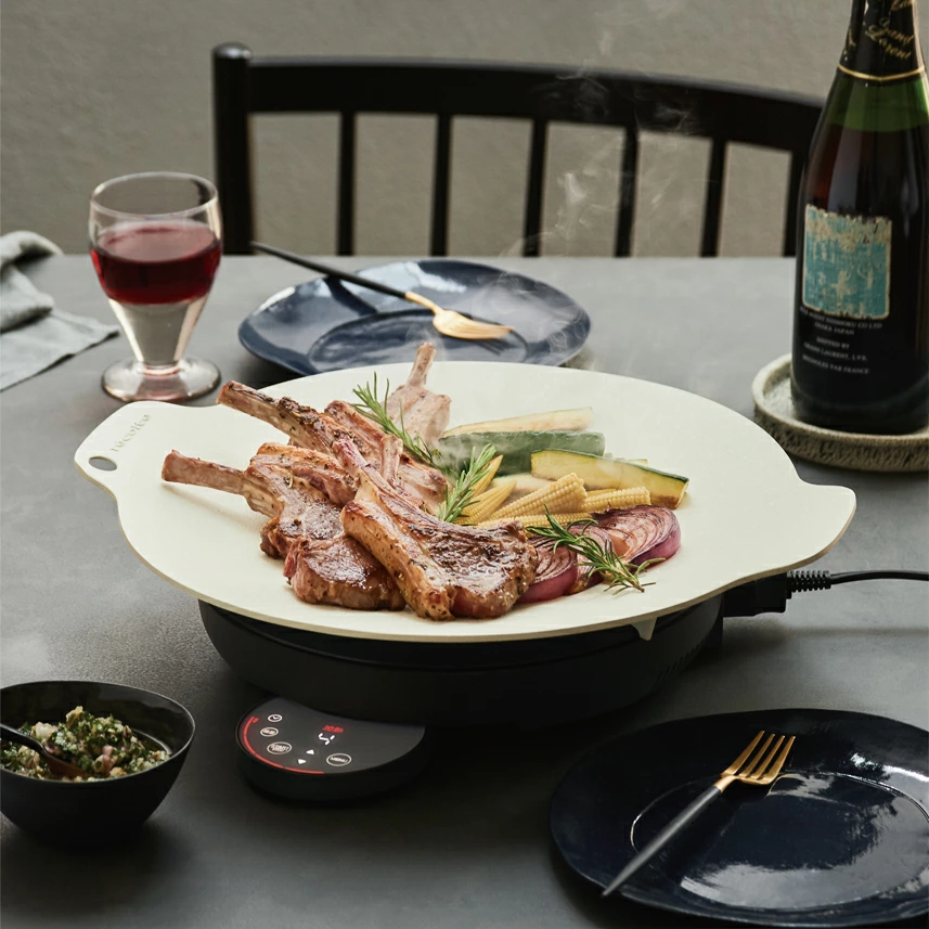 円形フォルムのIHヒーターとオフホワイトのグリドルプレートは、まるで食器のような佇まいで食卓になじみます。