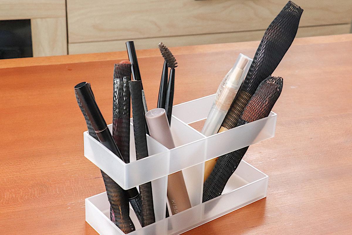 ただ、ペンやブラシのような細長いアイテムは中で倒れやすく、使いたいときに探しにくいのが気になっていました。