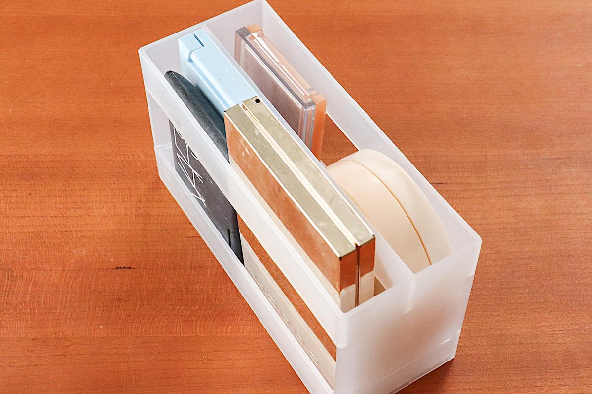 アイシャドウパレットやファンデーションを立てて入れるのに便利です。