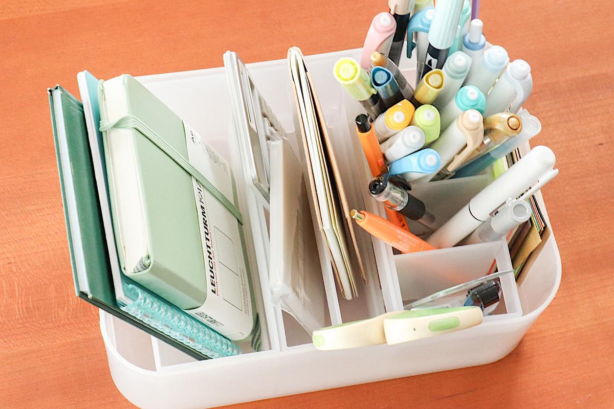 ペンやメモ、ノートなどをジャンルごとにまとめられるので、作業効率がアップしそうです。