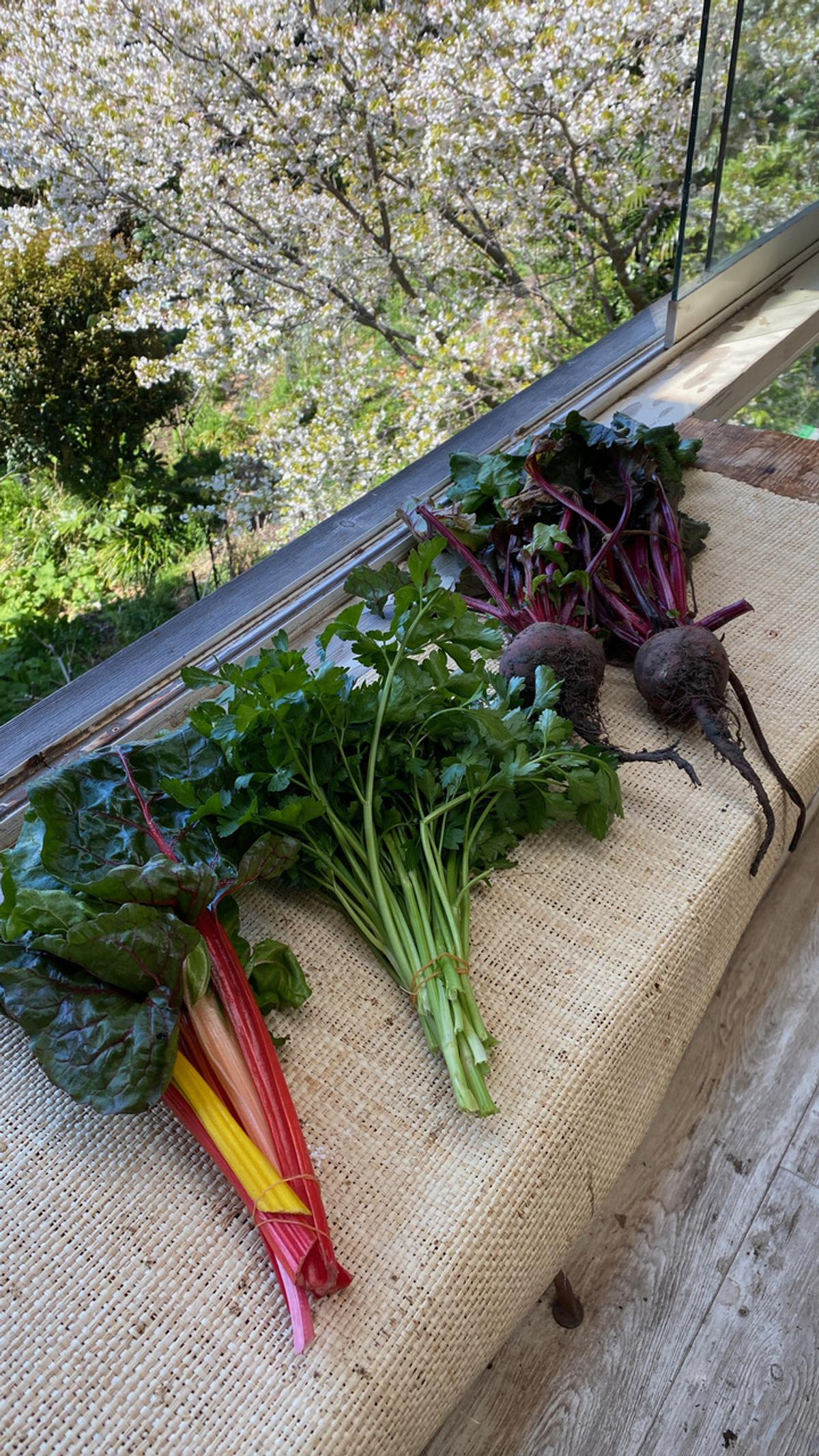 「ピンポ~ン」と別のご近所さん・新倉邦子さんがビーツ&スイスチャード&イタリアンパセリを持ってきてくれた。頂き物の多い我が家。ありがたきご近所さん。