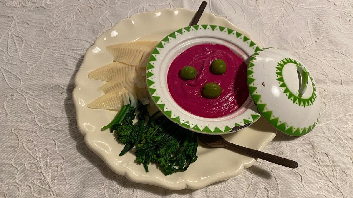朝いただいたビーツにひよこ豆や、胡麻ペースト、レモン汁、ニンニクなどを入れて、「フムス」を作ったら、これのうまいこと、うまいこと! 2月19日にMargo(祐天寺)で食べてあまりにおいしかったので、真似してみたのです。ビーツに手を出したのはこれが初めて! 嬉しい。