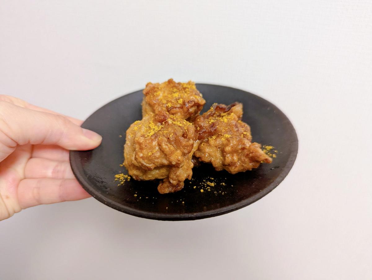 お惣菜のから揚げ3つに、小さじ1杯のスパイスをかけて食べたら立派なおつまみ誕生です。無意識のうちに、チューハイに手が伸びていました……。