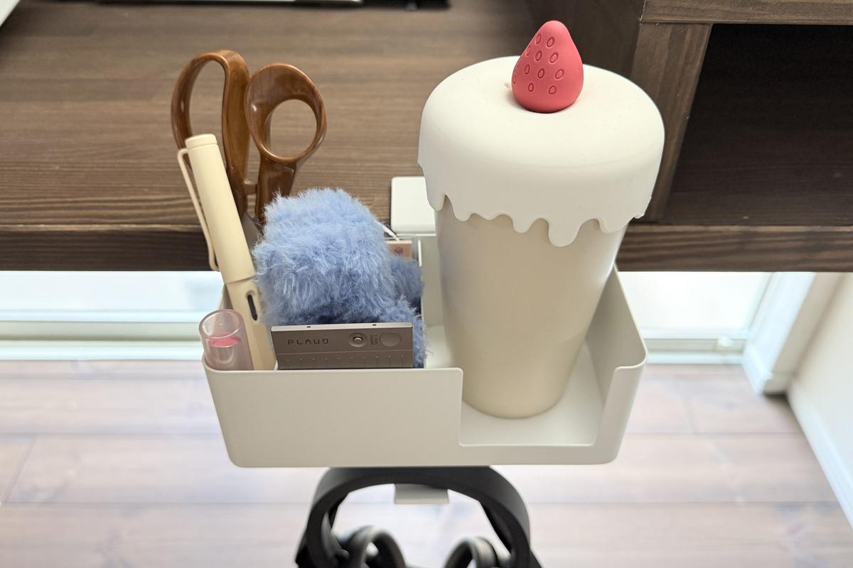 筆者はここに、ペンやハサミ、ミニサイズのメモ帳、ふせんなどの文房具類、ボイスレコーダー、ヘアクリップ、リップクリーム、ヘッドフォン、置き時計、目もと用のマッサージ器を置いて使っています。