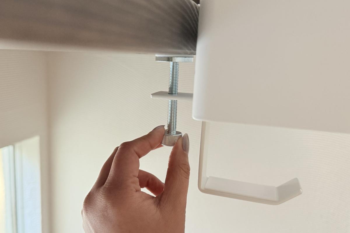 設置方法はとてもシンプルで、テーブルやデスクの天板に差し込んで固定するだけ。工具いらずで取り付けられるので、設置は2分ほどで完了しました。