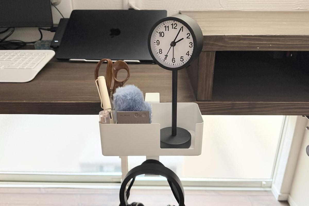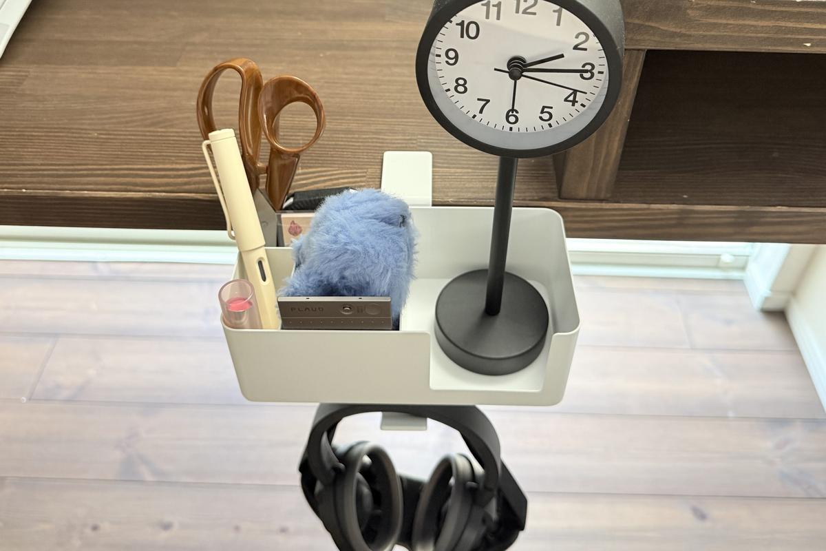 「テーブル横マルチラック」は、文房具や置き時計、ヘッドフォンなど、置き場所が決まっていなかった宙ぶらりんなものたちの受け皿になってくれるアイテムでした。全部まとめてここに置ける安心感は、思っていた以上に快適です。