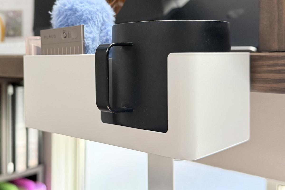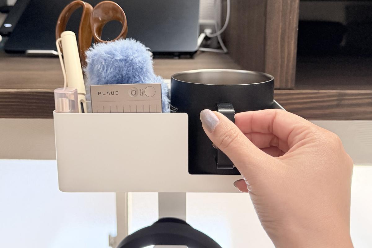 少し太めのマグカップもしっかり収まり、また持ち手が引っかかりにくい形状になっているので、使い勝手は良好です。マグカップをデスク上に置くよりも作業スペースを圧迫せず、デスクにコップの跡がつかないのも嬉しいところ。